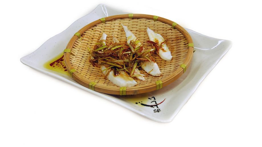 Mientras se van cocinando las doradas con el puerro verde, corta la parte blanca del puerro y el jengibre en juliana y saltéalo en una sartén. Cuando las verduras estén cocinadas pero crujientes, añade la salsa de soja.