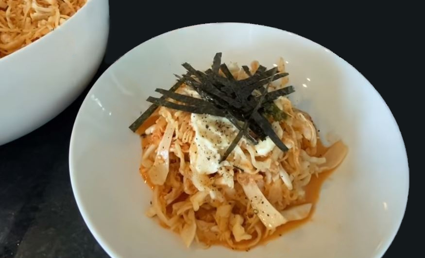 Mientras se hacen las semillas de sésamo, añade a la col el atún, la pasta Gochujang según tus gustos de picante, mayonesa, hondashi, aceite de sésamo. Añádelos de uno en uno y mezclando cada vez.