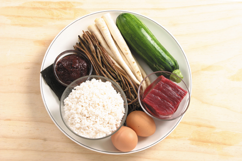 El Bibimbap (비빔밥) es un plato coreano compuesto de arroz blanco, verduras variadas, tiras de carne, huevo y pasta de guindilla.