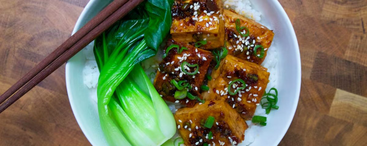 En un bol, sirve primero el arroz y encima, el tofu en un lado y la verdura en otro. Remata con un poco de la salsa reducida que quede en la sartén, la parte verde de la cebolleta china y el sésamo blanco.