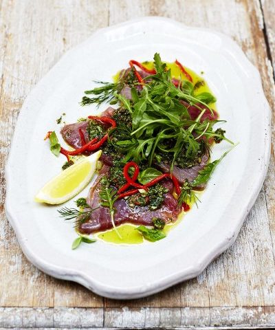 Organiza el atún en un plato de servir limpio, riega con un poco de AOVE, luego extiende toda la pasta de hiervas con una cuchara sobre el atún.