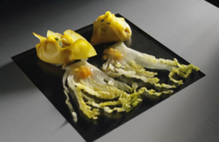 Sobre un plato coloca dos láminas de mango rellenas. Al lado de ellos coloca una lámina de cogollos en paralelo. Salsea estos con la vinagreta de pepitas de tomate.