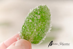 - Agarra un pétalo de flor con un par de tenacillas de cocina. Pasa una capa fina de clara de huevo por la parte inferior del pétalo seguido de una capa en la parte superior con un cepillo de artista o de repostería. Trabaja sobre el plato, espolvorea azúcar glas por la parte inferior del pétalo y pásala a una bandeja revestida de papel pergamino. Repite esto con los pétalos restantes.