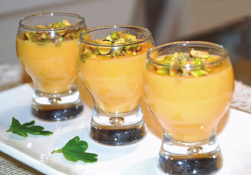 Sirve la crema en vasos de chupito o copas de cóctel, añade encima un poco de queso parmesano y espolvorea por encima el crujiente de pistacho.
