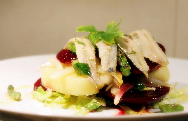 Coloca la lechuga en el fondo del plato y ve haciendo capas con las rodajas de remolacha, patata y un poco de la cebolla pochada. Después adereza con la vinagreta. Termina con los espárragos y encima los boquerones en vinagre.
