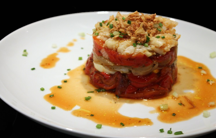 La ensalada de pimientos rojos asados con bacalao es un plato muy versátil porque puede tomarse acompañando una carne o un pescado, o en sí misma como plato. He preparado la ensalada aportándole pequeños detalles que la diferencian, ya que presenta diversas texturas que la hacen más sugerente: cebolla al dente; apio picado; cebollino; cebolla crujiente.