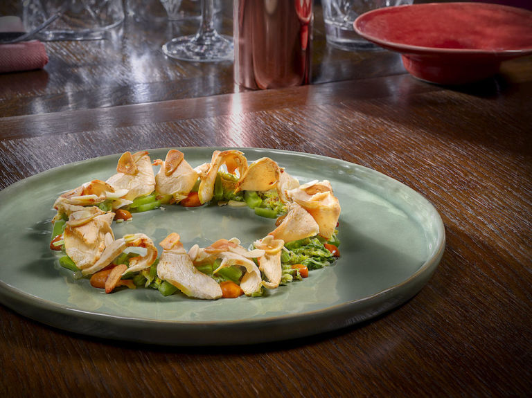 Salpimenta la pechuga de pollo, márcala en la sartén y después, corta en láminas finas.