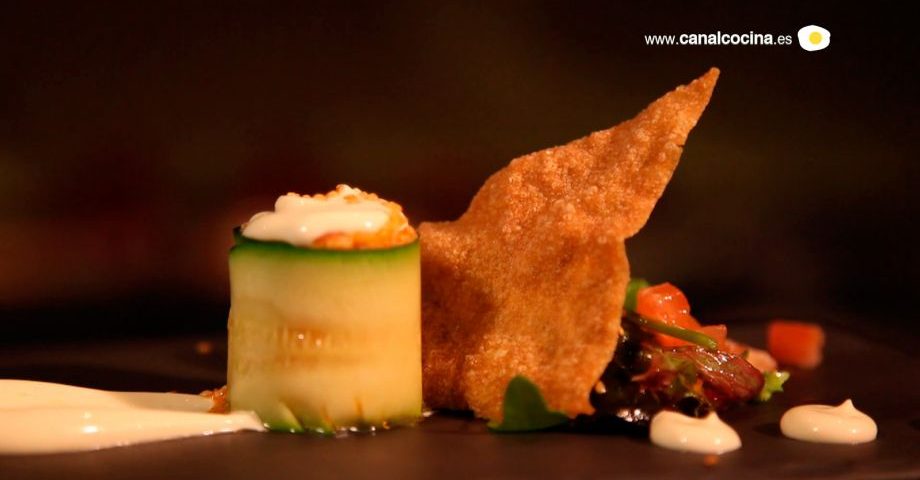 En un molde con forma cilíndrica, introduce una tira de calabacín y rellena con el txangurro. Pon un poco de mayonesa al lado y encima del txangurro.