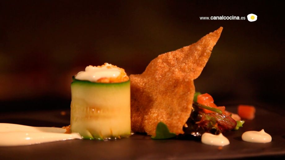 En un molde con forma cilíndrica, introduce una tira de calabacín y rellena con el txangurro. Pon un poco de mayonesa al lado y encima del txangurro.