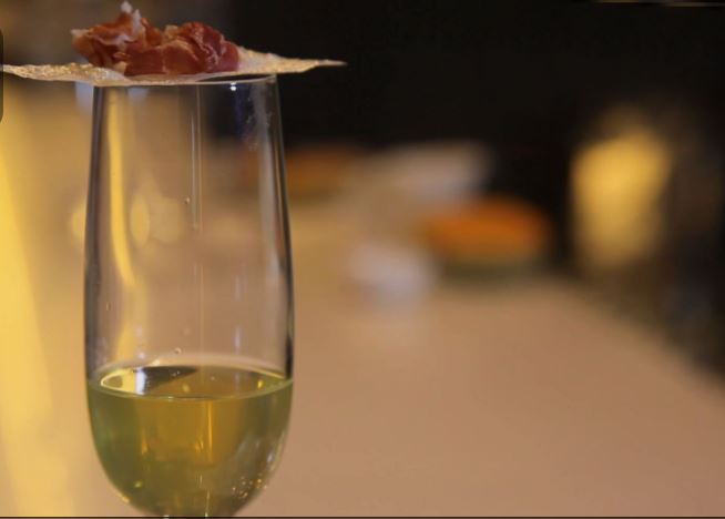 Echa un poco del jugo de melón en una copa de champán y, encima, dispón el obulato y una loncha de jamón.