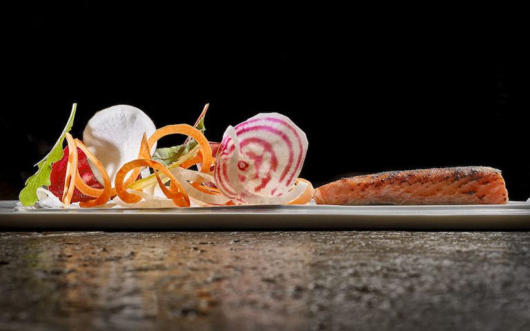 Una deliciosa combinación de salmón y verduras de apenas 400 calorías para deleite de vista y gusto, del maestro Ramón Freixa.