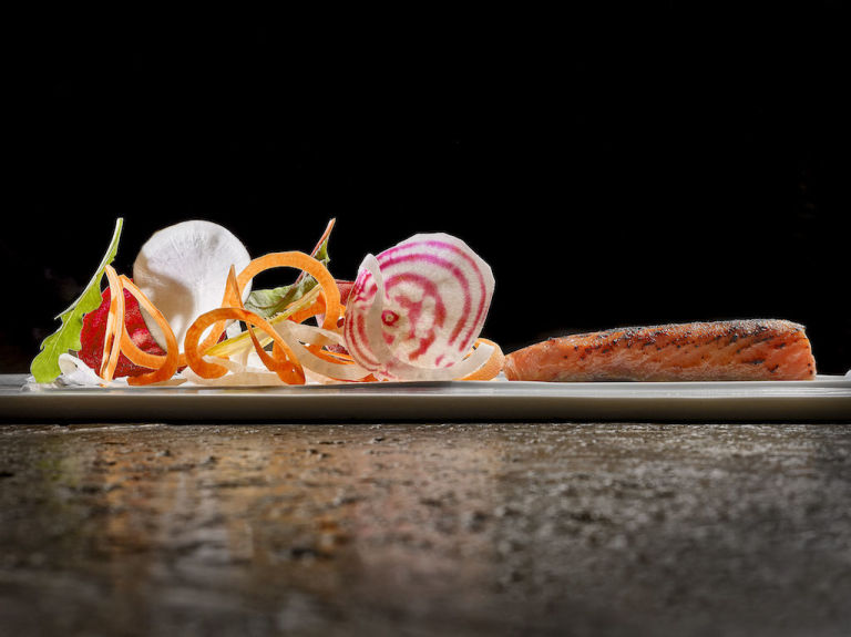 Una deliciosa combinación de salmón y verduras de apenas 400 calorías para deleite de vista y gusto, del maestro Ramón Freixa.