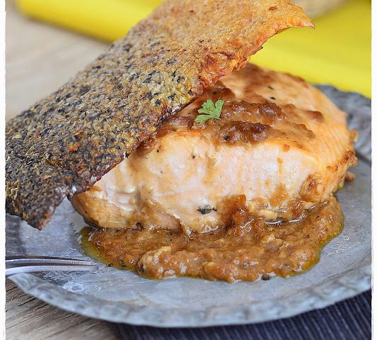 Te propongo que presentes el salmón con una cama de cebolla roja confitada, tu puré favorito o simplemente unas verduritas al dente. Coloca encima uno o dos trozos de salmón y en la parte de arriba, coloca la piel crujiente.