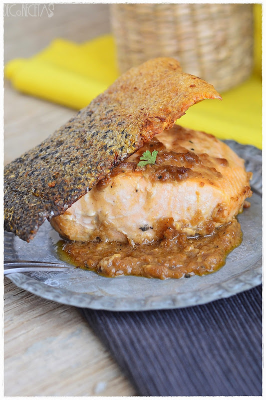 Te propongo que presentes el salmón con una cama de cebolla roja confitada, tu puré favorito o simplemente unas verduritas al dente. Coloca encima uno o dos trozos de salmón y en la parte de arriba, coloca la piel crujiente.