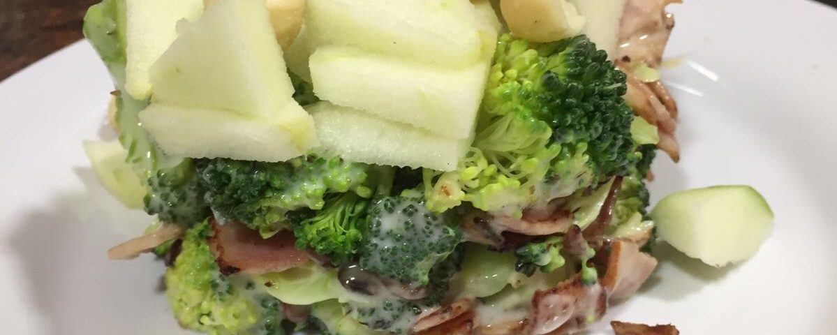 Con ayuda de un molde, pon el brócoli con la manzana, el bacon de pavo y unos trozos de nueces. A continuación, agrega la salsa por encima.