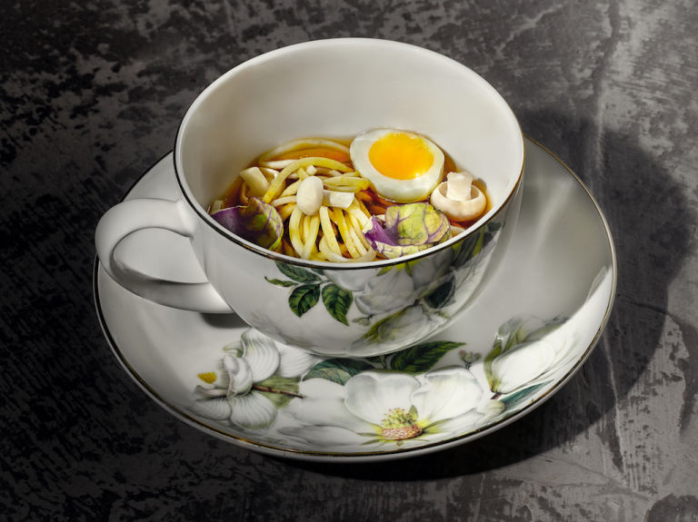Sirve el caldo en una taza cuando los ingredientes estén hechos y coloca el huevo cocido cortado por la mitad.