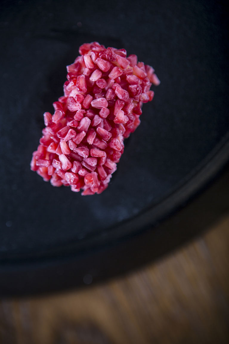 Por último, coge un trozo de tomate y rebózalo en los granos de frambuesa ultra congelados.
