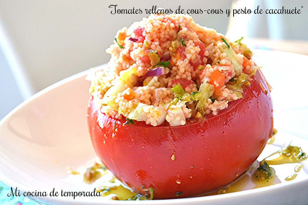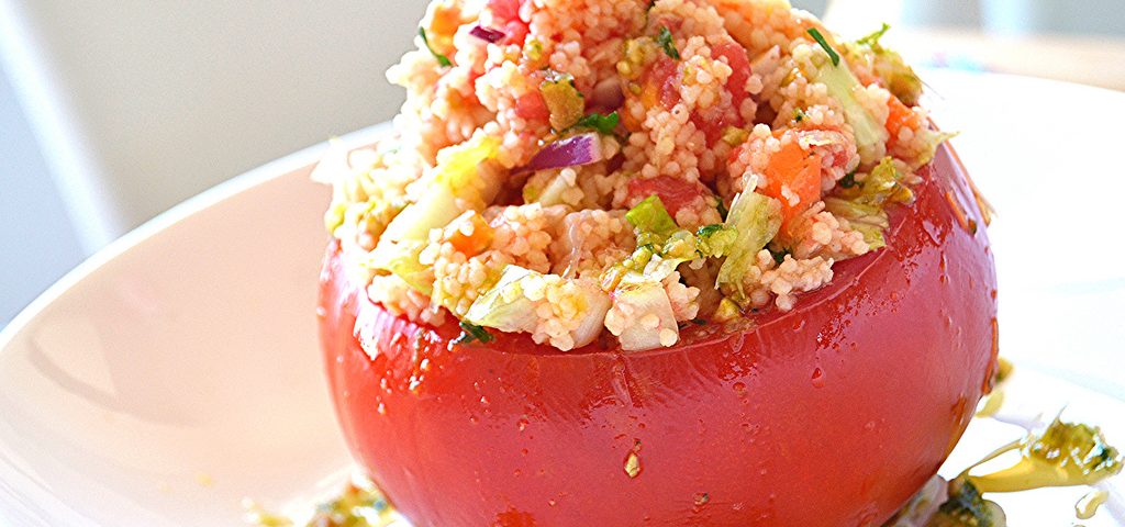 Añade ahora la lechuga al resto de verduras y mezcla con el cous-cous. Rellena los tomates con la mezcla.
